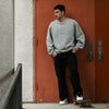 胸にエンボス加工のコラボアートを配したスウェット。
