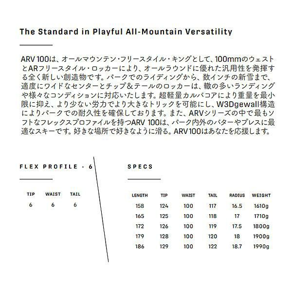 他の画像を見る アルマダ スキー板 ARMADA ARV 100 スキー単品 (板のみ) RA0000748 エーアールブイ 100 (25-26 2026) 日本正規品【L2】【代引不可】 メーカー希望小売価格 ¥ 115,500 販売価格 ¥ 103,900 税込 在庫切れ カートに入れる お気に入りに登録する