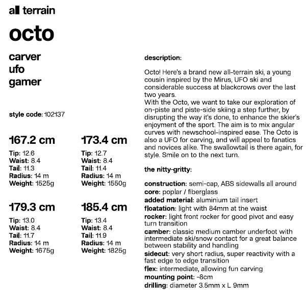 octoは、エッジグリップと操作性を両立させたオールラウンドスキーです。中程度のフレックスで、さまざまな地形での安定した滑走が可能。特にカービングターンを好むスキーヤーに向けたモデルです。