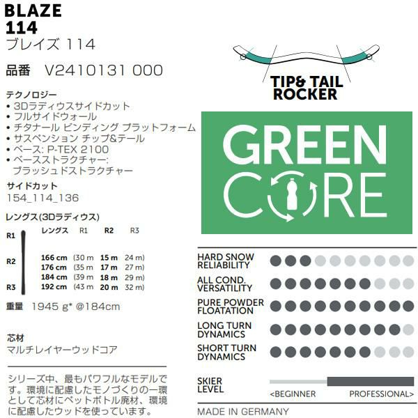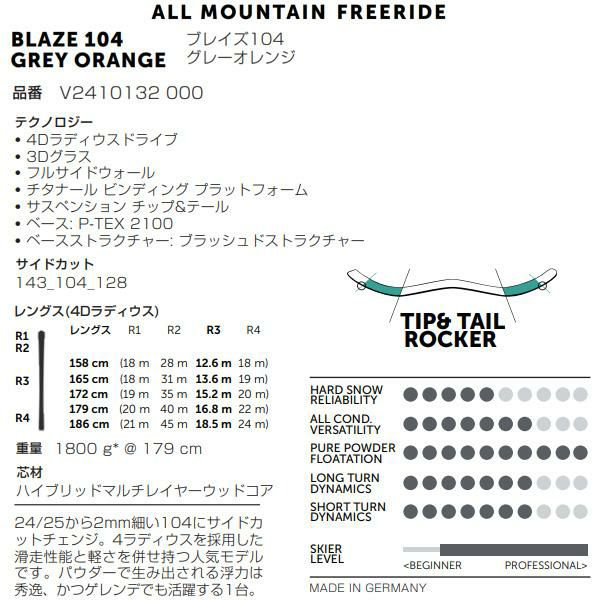 一方、BLAZEシリーズは、2024-25シーズンに登場した104モデルが注目されています。 軽さと滑走性を兼ね備え、日本のバックカントリーシーンで際立つ存在感を放つBLAZEシリーズは、昨シーズンまでの「BLAZE 106」より2mmサイドカットした104が登場。滑走性能と軽さを併せ持つモデルです。
