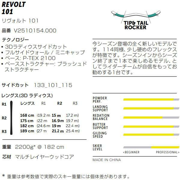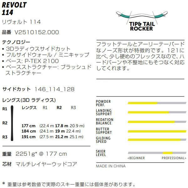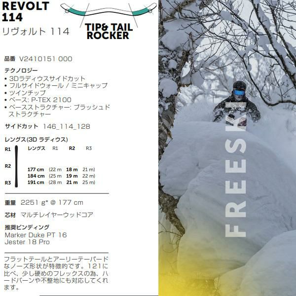 2025年のREVOLTシリーズは、フリースタイル向けのスキー板で、104と121の中間モデルの「REVOLT 114」が登場しています3. これはパーク内でもパーク外でもリッピングできるオールマウンテン フリースタイル用スキーで、滑りやジャンプでスタイルを出したい方におすすめです.。