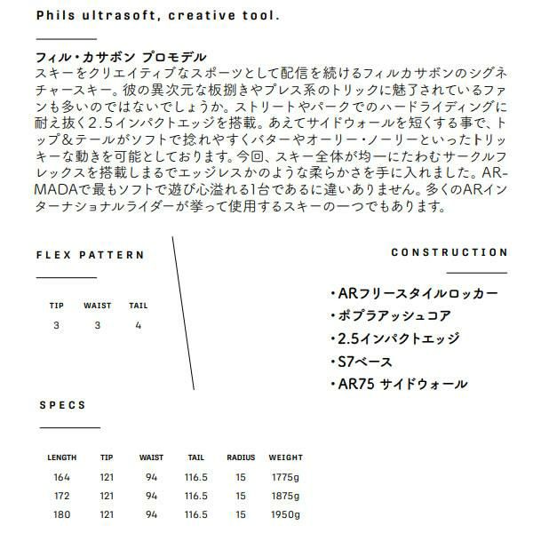 パークやキッカー、トリックを滑る為のフリースタイルスキー、ゲレンデ内外の未圧雪エリアを滑るパウダースキー、いわゆる山全体を滑るフリーライドスキー、オールマウンテンスキー、コブ斜面を滑る為のモーグルスキー等、幅広いジャンルのスキーをラインナップ。