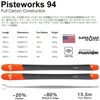 Pisteworksシリーズは、DPSから新しく登場したカービングスキーです。硬めのカービングスキーと思われがちですが、実際はトップからテール方向にしなやかにたわみ、テール側がソフトに感じられ、力のない方や女性の方でもしっかりとスキーを踏み込むことがでしき、レベルや体格を選ばずにキレのあるカービングターンが楽しめます。Pisteworks 94は、オールマウンテンで使えてカービングも楽しみたい欲張りなスキーヤーに最適の1台です。