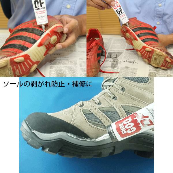 シューズのソールはほとんどが接着材で貼り付けてあります。ソールとアッパーの間に水や砂など細かな汚れが入ると靴底はがれの原因となります。SHOE GOO DFはソールのはがれ防止のために最適な素材です。