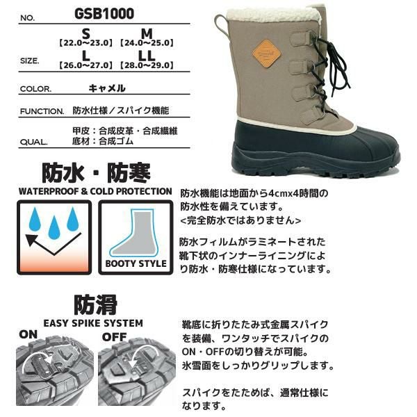 他の画像を見る スノーブーツ スパイク内蔵 防水・防寒 GROWHILL グローヒル GSB1000 キャメル メンズ・レディース ハイカット スノーブーツ シューズ メーカー希望小売価格 ¥ 9,990 販売価格 ¥ 9,300 税込 カートに入れる お気に入りに登録する