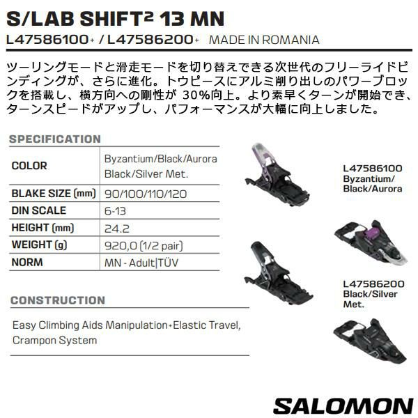S/LAB SHIFT2 13 MNは、解放強度が6.0〜13.0に設定されたハイブリッドビンディングで、ツーリングとアルパインスキーの両方に対応します。軽量設計でありながら高いパワー伝達性能を実現し、MNC対応で多様なブーツに適合します。