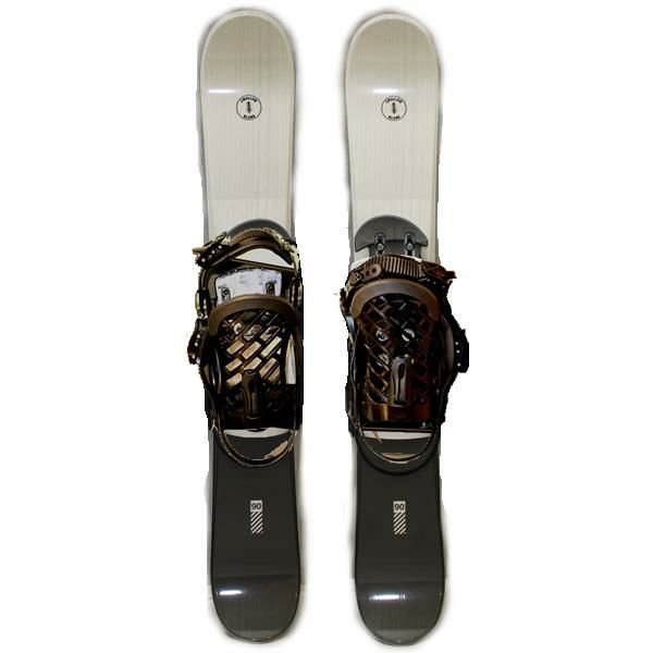 普通はスキーブーツでないと装着できないビンディングが取り付けられているんですが、こちらはスノーボードビンディングが