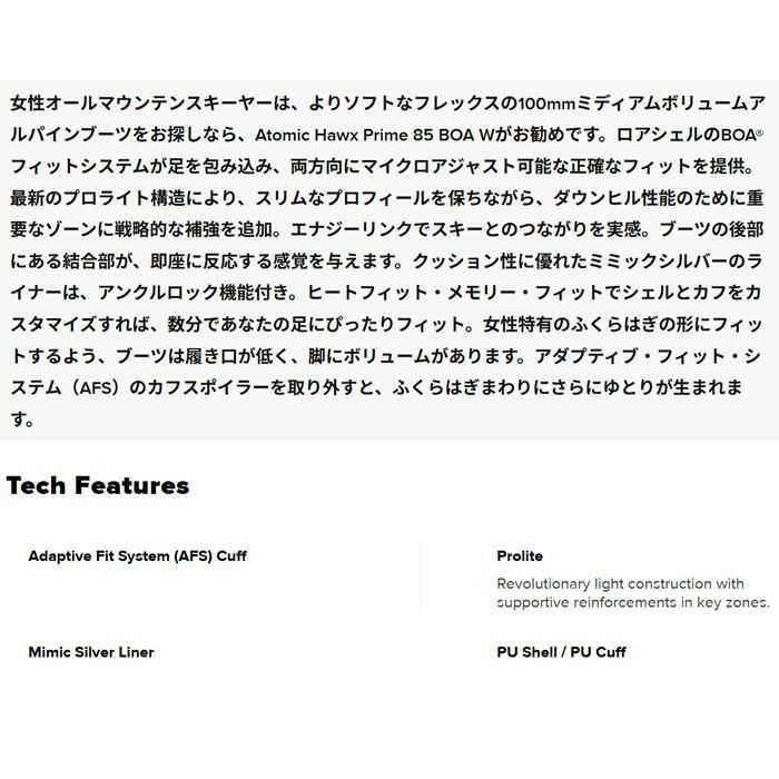 他の画像を見る アトミック スキーブーツ レディース BOA ATOMIC HAWX PRIME 85 BOA W (25-26 2026) (AE5032520) メーカー希望小売価格 ¥ 93,390 販売価格 ¥ 79,300 税込 カートに入れる お気に入りに登録する