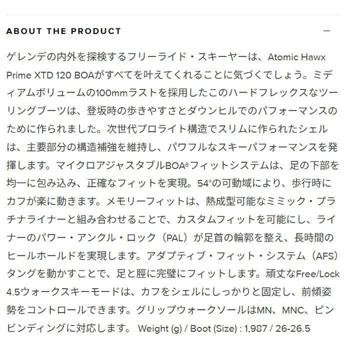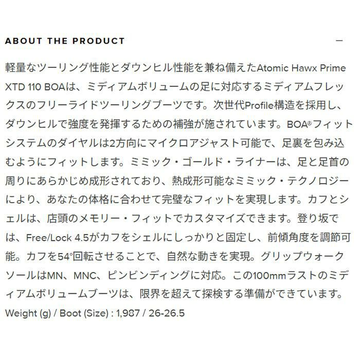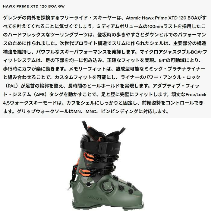 他の画像を見る アトミック スキーブーツ BOA ATOMIC HAWX PRIME XTD 120 BOA テックビンディング 対応 (25-26 2026) (AE5030320) メーカー希望小売価格 ¥ 131,890 販売価格 ¥ 112,000 税込 カートに入れる お気に入りに登録する