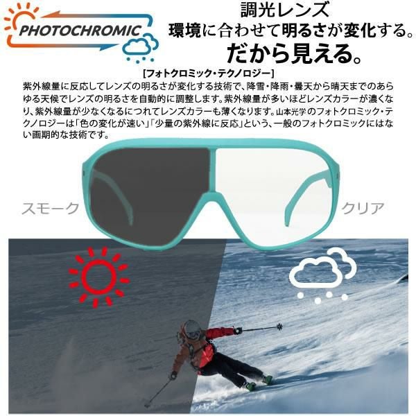 SNOWFIELDの主なモデルには、調光レンズモデルと偏光レンズモデルがあります。調光レンズは紫外線量に応じて色調が変化し、自転車通勤や遠征時に最適です。偏光レンズはギラギラした乱反射光をカットし、緑の多い景色などで視界をスッキリと保ちます。