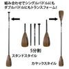 シングルで使う4分割パドルにもう一枚ブレードをセットした5分割仕様。スタンドではシングルスタイルで。座って漕ぐ場合はダブルパドルにするとカヤックスタイルで推進力もアップし、持ち替える手間も減るので効率的です。