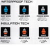 30K防水、フルシームシール、SPACE HEATERスマートライナーテックによる軽量保温。SPACE HEATERは、プリマロフト保温材、スペースメッシュ、エアテック3Dマイクロフリースをゾーンごとに配置し、通気性と保温効率を最適化。本体、腕、フードには60/40gのゾーン別プリマロフトリサイクル保温材、腎臓部には100gを採用。シェルと保温材は100%リサイクルファブリック。ラミネート加工されたバータックとブランドロゴが嵐を防ぎ、遊びを妨げません。