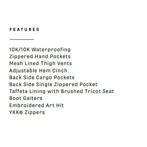 主要な箇所にシームテープ加工、YKKジッパー、タフタライニング、調整ウェストバンド、内ベンチレーション、フロントポケット、バックポケット、ブーツゲーター、裾はギャザーとドローコードで調整可能。