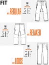 立体裁断のひざまわり、ドローコードとエラスティックバンドのウェスト、フルシームテープ加工、YKKジッパー、フラップ付きカーゴポケット、ベンチレーション、ブーツゲーター。