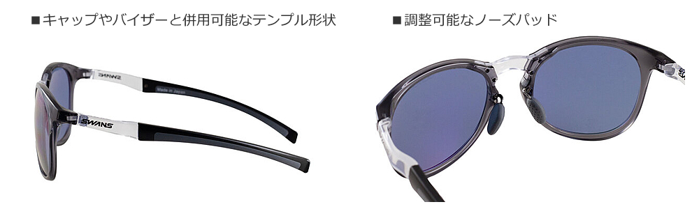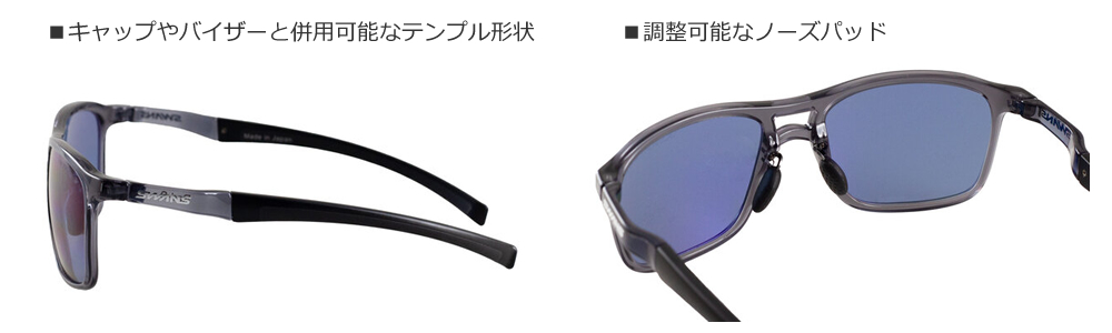 見た目のカッコ良さだけでなく、スウィング時にズレないフィット感を実現するテンプル構造等、こだわりの設計になっている。